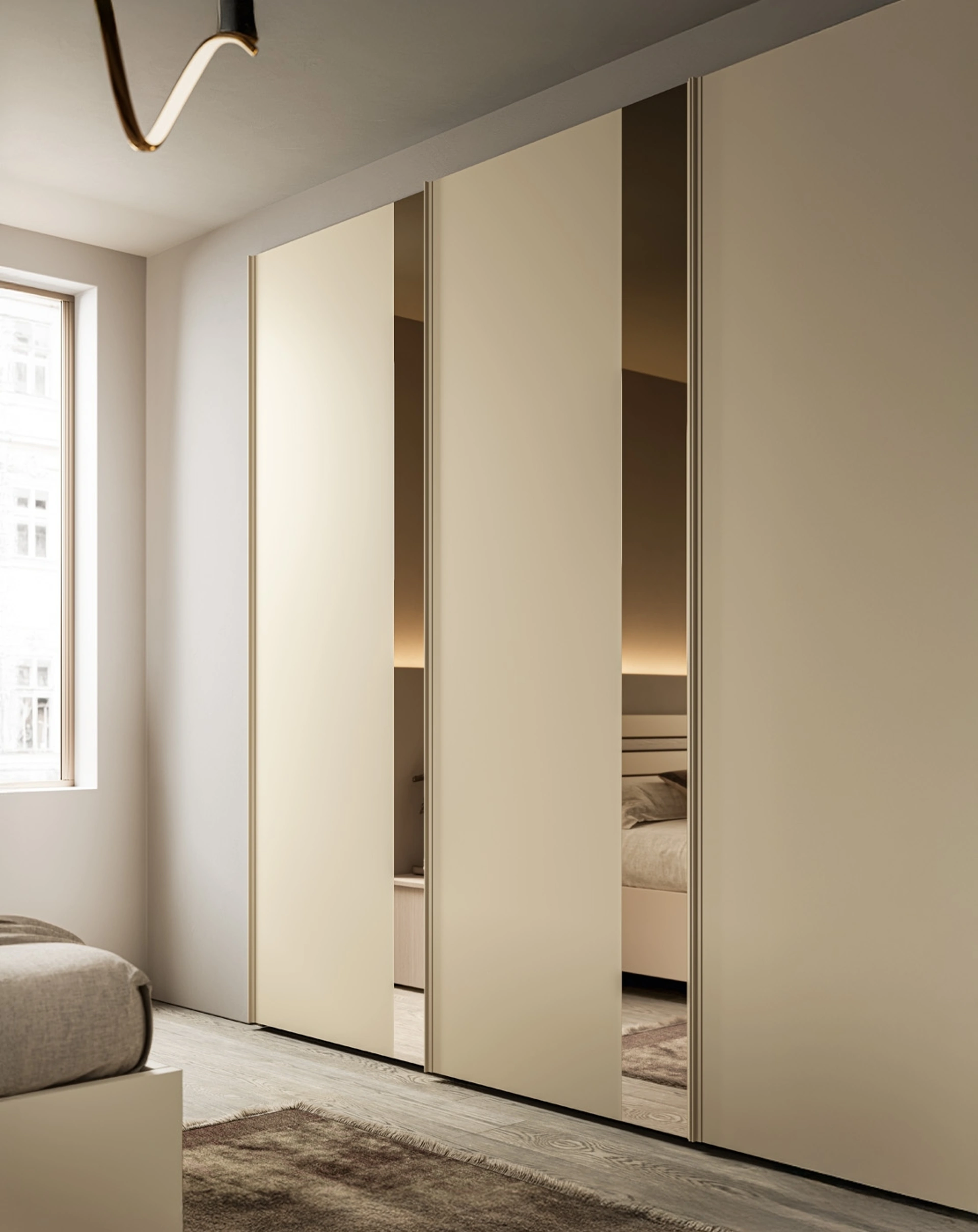 Gli Armadi e le cabine armadio con ante scorrevoli devono arredare la zona notte garantendoti una perfetta organizzazione degli spazi e un'esclusiva ricerca estetica. Contattaci per info e preventivi e potrai completare la zona notte che hai sempre desiderato grazie ad una ricca varietà di contenitori moderni come quest'armadiatura in melaminico nella fotografia. Per completare ottimamente il progetto d'arredo, opta per le nostre proposte di Arredamento Casa delle migliori marche, letti, armadi e comò diversi per buon gusto, dimensione e materiale. La zona notte è dedicata al relax, deve dunque risultare ammobiliata al meglio e completa di mobili e oggetti accessori capaci di creare un'atmosfera sempre distensiva.