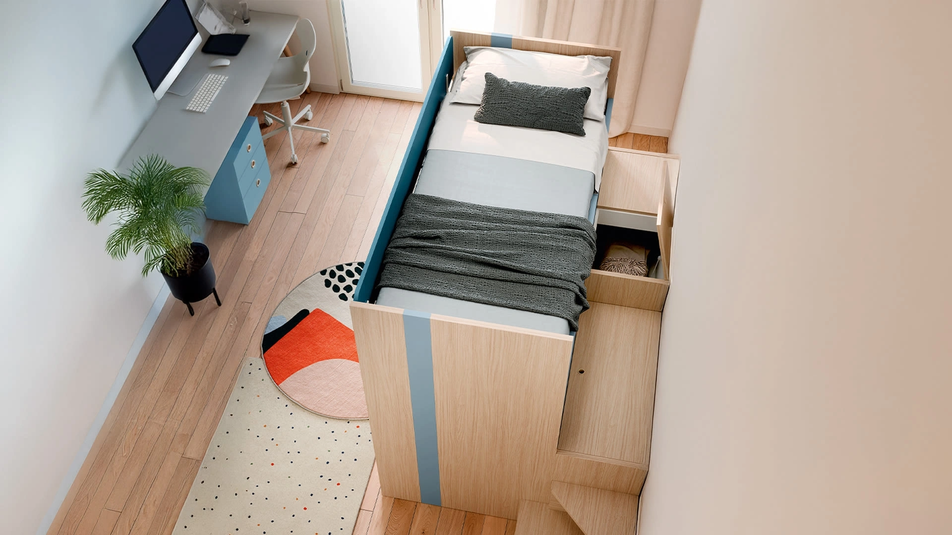 Questa proposta in melaminico ultima perfettamente le doti di funzionalità e l'estetica della camaretta, poiché è capace di congiungere funzionalità ed ergonomia. Porta estetica e colori vivaci nella stanza dedicata ai più piccoli con questa proposta, una delle Camerette con letti a castello per bambini di Nidi. Nella progettazione della stanza dei giovani affidati a noi: in negozio presentiamo tutte le più belle composizioni arredative moderne per la loro camera. Se cerchi spunti progettuali per progettare perfettamente la stanza dei tuoi figli, ti presentiamo la Cameretta con letti a castello Lila di Nidi con finitura in melaminico.