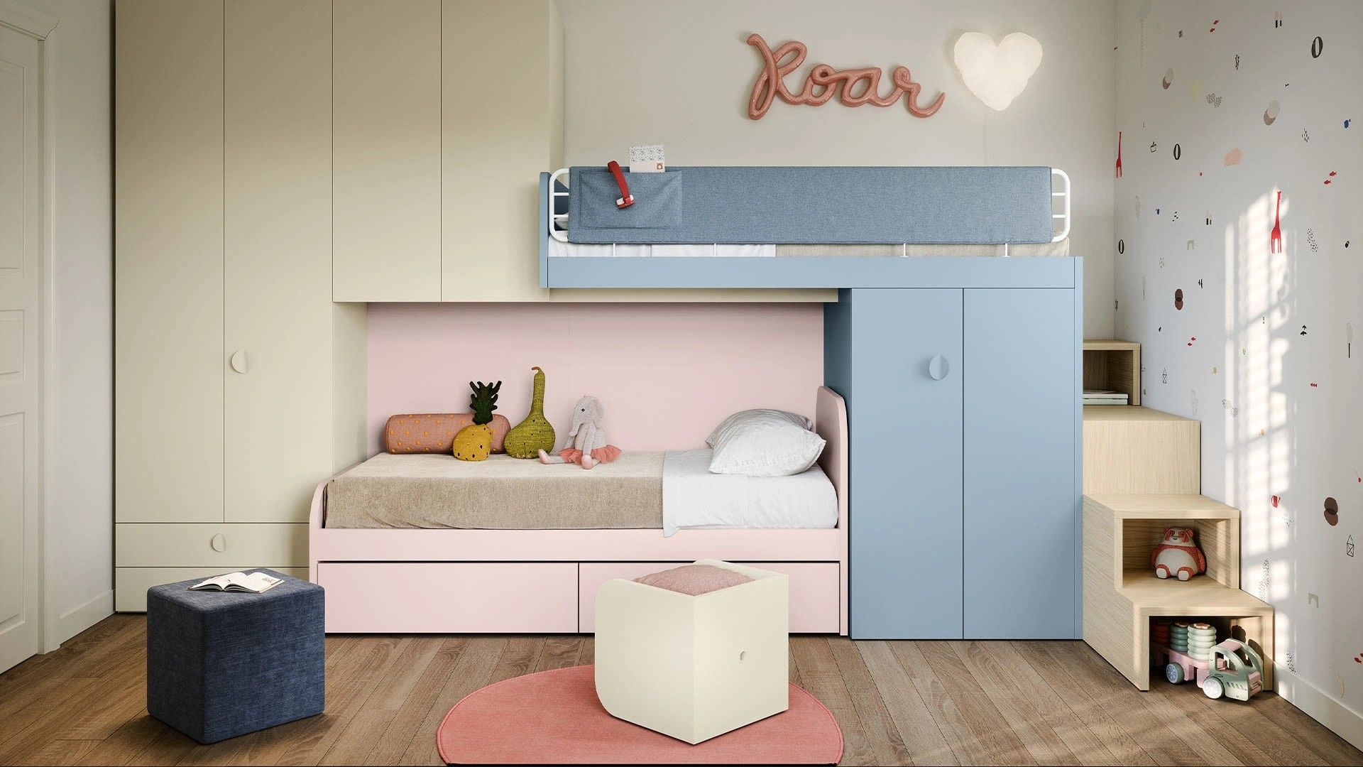Il noto brand produce diverse soluzioni moderne, in questo modo la cameretta diventa un locale dove i vostri figli potranno crescere e riposare. Per arredare ottimamente le Camerette, Nidi propone progetti articolati e multifunzionali: sono varie le attività che i tuoi bambini portano a termine lì. Venire in negozio vuol dire vedere dal vivo tutte le più belle soluzioni per bambini a soppalco in melaminico che presentiamo in negozio. Questa soluzione con finitura in melaminico, tra quelle a soppalco per bambini di Nidi, soddisfa le aspettative degli adulti e i gusti dei piccoli.